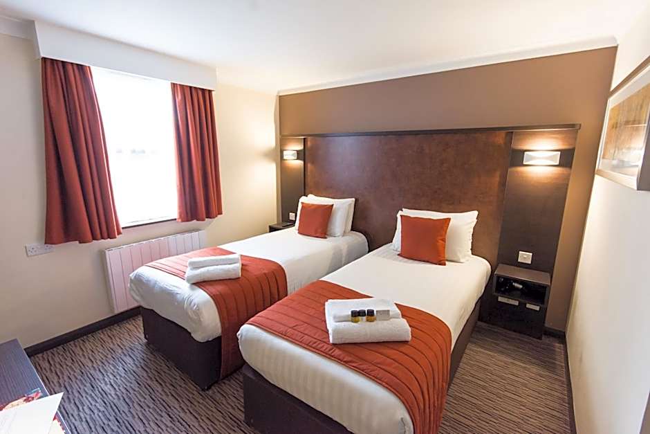 This twin bedroom is decorated in warm colors. All rooms offer a flat-screen TV with Freeview channels and tea and coffee making facilities. The room has arm chairs and a desk with lamp and connection to complimentary high-speed WiFi.